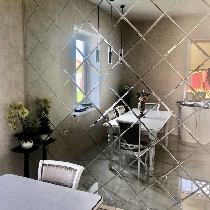 Использована серебристая квадратная зеркальная плитка размером 18х18.